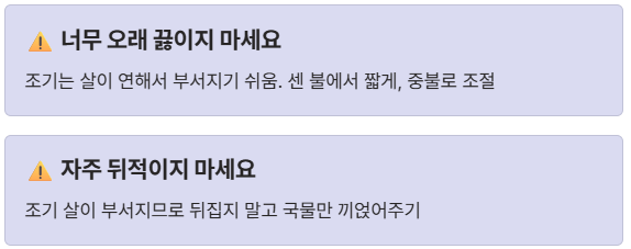 - ✅ 조기는 절대 오래 끓이지 마세요! 살이 부서지지 않도록 짧게 끓여야 합니다.