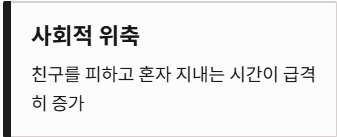 | 사회적 위축 | 친구를 만나지 않고 혼자 지내는 시간이 급격히 늘어남 |