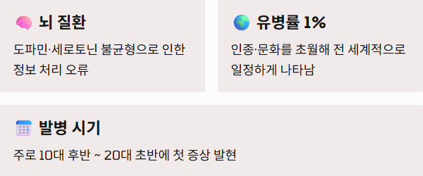 - 유병률: 전 세계적으로 약 1%의 일정한 유병률을 보이며, 대개 10대 후반에서 20대 초반에 발병합니다.