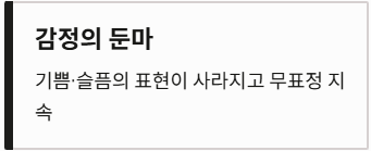 | 감정의 둔마 | 기쁘거나 슬픈 감정 표현이 없어지고 무표정한 상태가 지속됨 |