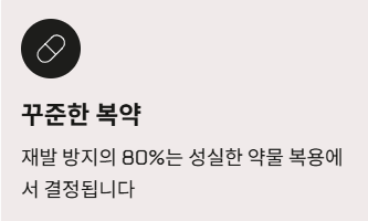 - 지속적 치료: 약물 치료는 재발을 막는 가장 강력한 도구이며, 임의 중단은 금물입니다.