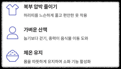 지압뿐만 아니라 생활 습관도 중요합니다. 꽉 끼는 옷은 벗고 허리띠를 느슨하게 풀어 복부 압박을 줄여주세요. 그리고 눕기보다는 등을 벽에 기대어 앉거나 가볍게 거실을 걷는 것이 중력의 도움을 받아 음식물을 내리는 데 효과적입니다.