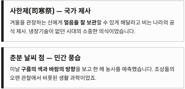 춘분에는 국가적인 제사인 '사한제(司寒祭)'를 지냈습니다. 겨울을 관장하는 신에게 얼음을 잘 보관할 수 있게 해달라고 비는 제사였죠. 민간에서는 '춘분 날씨 점'을 쳤는데, 이날 구름의 색과 바람의 방향을 보고 한 해 농사를 예측했습니다.