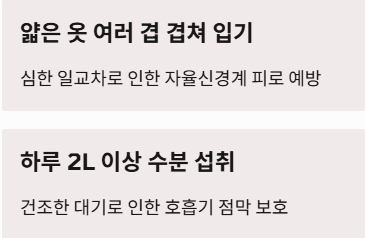 | 심한 일교차 | 자율신경계 피로, 체온 조절 저하 | 얇은 옷 여러 겹 겹쳐 입기 |