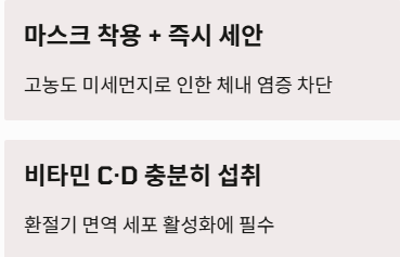 | 고농도 미세먼지 | 체내 염증 지수 상승 | 마스크 착용 및 귀가 후 즉시 세안 |