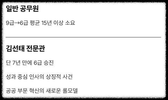 - 파격적인 인사 단행: 김선태 전문관은 9급으로 임용된 지 약 7년 만에 6급으로 승진했습니다. 보통 공무원 사회에서 9급에서 6급까지 승진하는 데 평균 15년 이상이 소요되는 점을 감안하면, 이는 유례를 찾아보기 힘든 '초고속 승진'입니다. 이는 성과 중심 인사가 공직 사회에도 도입될 수 있음을 보여준 상징적 사건이었습니다.
