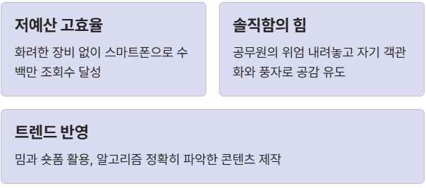 - 저예산 고효율의 정수: 충주맨 김선태 전문관은 화려한 편집 기술이나 고가의 장비 대신 스마트폰 하나로 시작했습니다. 수천만 원의 예산을 들이고도 조회수 100회를 넘기기 힘든 다른 지자체와 달리, 그는 0원에 가까운 예산으로 수백만 조회수를 기록했습니다. 이는 '콘텐츠의 본질'이 장비가 아닌 '기획력'에 있음을 증명한 사례입니다.