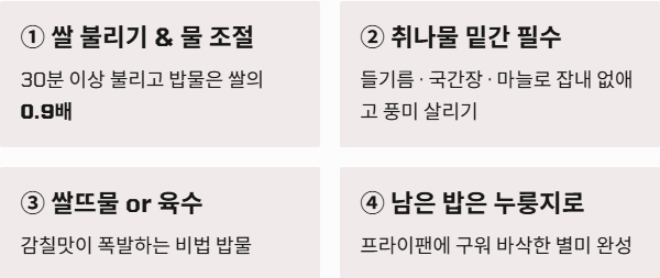 3. 쌀뜨물 또는 육수 활용: 밥물로 쌀뜨물이나 표고버섯/다시마 육수를 사용하면 감칠맛이 폭발해요.