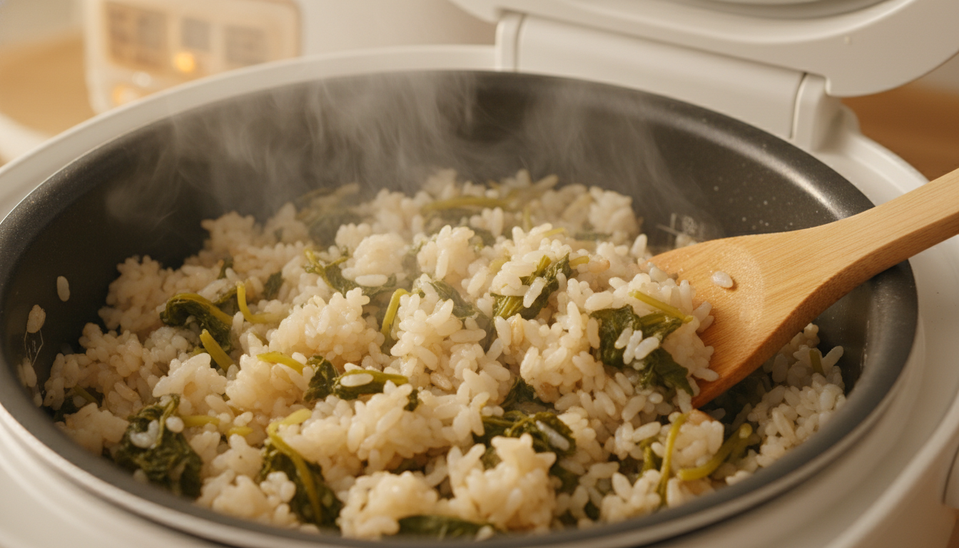 - 밥 짓기: 솥이나 밥솥에 불린 쌀을 넣고, 양념한 취나물을 쌀 위에 골고루 얹어줍니다. 쌀과 동량 또는 약간 적게 물(쌀뜨물도 좋아요!)을 부어 평소 밥 짓듯이 조리해 주세요. 취나물에서 수분이 나오므로 물 양은 평소보다 약간 적게 잡는 것이 포인트예요.