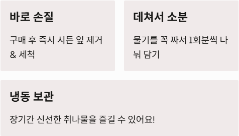 생취나물은 냉장 보관 시 쉽게 시들 수 있으니, 구매 후 바로 손질하여 데친 다음 물기를 꼭 짜서 소분하여 냉동 보관하는 것이 좋아요. 이렇게 하면 신선한 취나물을 오랫동안 즐길 수 있답니다.