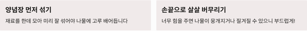 - 양념장 먼저 섞기: 위 양념 재료들을 한데 모아 미리 잘 섞어주세요. 그래야 양념이 나물에 고루 잘 배어듭니다.