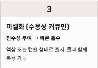 | 미셀화(수용성) 커큐민 | 친수성 부여로 빠른 흡수 | 액상 형태나 캡슐형으로 주로 출시 |