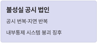 - 불성실 공시 법인 지정: 공시 번복이 잦거나 지연하는 기업은 내부 통제 시스템이 붕괴되었다는 신호입니다.