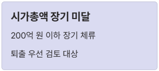 - 시가총액 미달: 주가 하락으로 인해 시가총액이 200억 원 아래에서 장기간 머무는 경우 퇴출 우선 검토 대상이 됩니다.