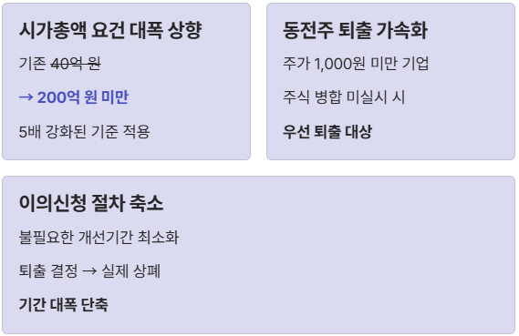 - 이의신청 절차 축소: 불필요한 개선 기간 부여를 최소화하여 퇴출 결정 후 실제 상폐까지의 기간을 단축합니다.