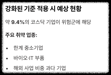 강화된 기준을 적용했을 때, 현재 코스닥 시장에서 주의가 필요한 업종군과 기업들의 재무 건전성을 분석해 보았습니다. 아래 표는 특정 기업명을 명시하지 않으나, 위험군에 속하는 기업들의 공통 지표를 보여줍니다.