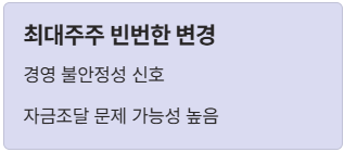 - 잦은 최대주주 변경: 주인이 자주 바뀌는 기업은 경영 안정성이 낮고, 자금 조달에 문제가 생겼을 가능성이 큽니다.