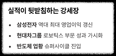 이러한 낙관적인 전망의 근거는 실적입니다. 삼성전자의 영업이익이 역대 최대치를 갱신하고 있고, 현대차 그룹의 로보틱스 부문이 가시적인 성과를 내기 시작했기 때문입니다. 다만, 글로벌 금리 인하 속도와 지정학적 변수에 따른 변동성은 상존하므로 '분할 매수' 전략은 여전히 유효합니다.