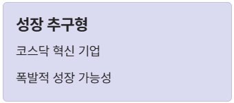 | 상장 기업 | 대기업, 전통 산업군 | 중소·벤처, IT/바이오 |