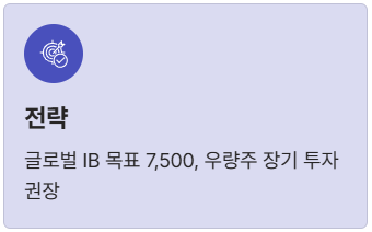 - 전략: 글로벌 IB들은 목표치 7,500을 제시하고 있으며, 우량주 중심의 장기 투자가 권장됩니다.