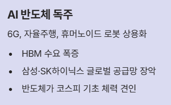 - AI 반도체의 독주: 6G 통신과 자율주행, 휴머노이드 로봇의 상용화로 고대역폭메모리(HBM) 수요가 폭증했습니다. 삼성전자와 SK하이닉스가 글로벌 공급망의 핵심을 장악하며 코스피의 기초 체력을 비약적으로 끌어올렸습니다.