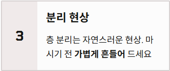 - 분리 현상: 시간이 지나면 층이 분리될 수 있으나, 이는 자연스러운 현상이므로 마시기 전 가볍게 흔들어 드시면 됩니다.