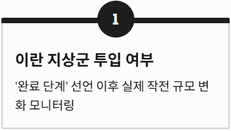 우리는 앞으로 몇 가지 흐름을 지켜봐야 합니다. 첫째, 이란의 '완료 단계' 선언 이후 실제 지상군 투입 여부. 둘째, 유가 안정을 위한 미국 내 증산 속도. 셋째, 글로벌 시장 변동성과 한국 경제에 미칠 영향.