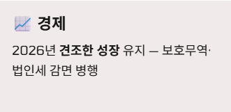 - 2026 경제 성장 가이드라인: 강력한 관세 정책을 유지하되, 법인세 추가 감면을 통해 미국 내 제조업 부흥을 가속화하여 2026년에도 견조한 성장을 유지하겠다는 포부를 밝혔습니다.