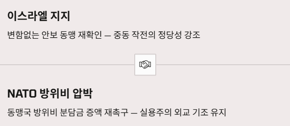 - 동맹국에 대한 메시지: 이스라엘에 대한 변함없는 지지를 확인하는 동시에, 나토(NATO) 등 동맹국들에게 방위비 분담금 증액을 다시 한번 압박하는 실용주의적 태도를 보였습니다.