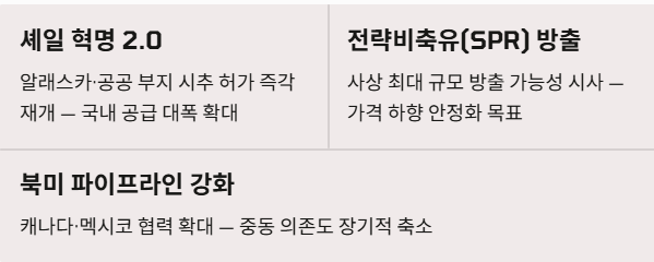 - 셰일 혁명 2.0: 환경 규제로 묶여있던 알래스카 및 공공 부지의 시추 허가를 즉각 재개하여 공급량을 대폭 늘릴 계획입니다.