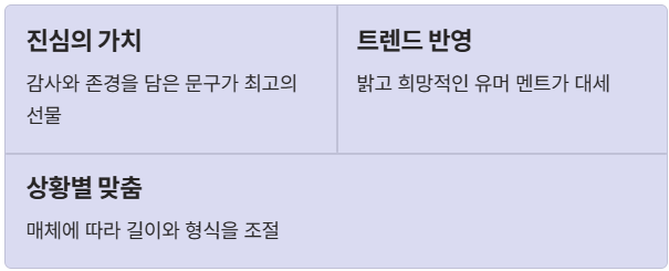 트렌드 반영: 무거운 인사보다는 밝고 희망적인 유머 멘트가 인기입니다.