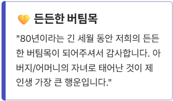 - 세월의 헌신에 대한 감사: "80년이라는 긴 세월 동안 저희의 든든한 버팀목이 되어주셔서 감사합니다. 아버지/어머니의 자녀로 태어난 것이 제 인생 가장 큰 행운입니다."