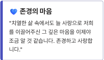 - 존경의 마음: "치열한 삶 속에서도 늘 사랑으로 저희를 이끌어주신 그 깊은 마음을 이제야 조금 알 것 같습니다. 존경하고 사랑합니다."