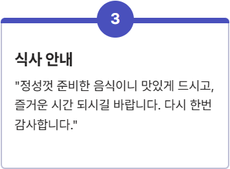 - 식사 안내: "정성껏 준비한 음식이니 맛있게 드시고, 즐거운 시간 되시길 바랍니다. 다시 한번 감사합니다."