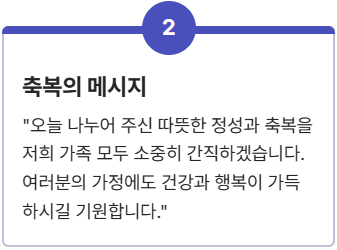 - 축복의 메시지: "오늘 나누어 주신 따뜻한 정성과 축복을 저희 가족 모두 소중히 간직하겠습니다. 여러분의 가정에도 건강과 행복이 가득하시길 기원합니다."
