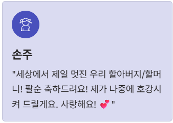 - 손주: "세상에서 제일 멋진 우리 할아버지/할머니! 팔순 축하드려요! 제가 나중에 호강시켜 드릴게요. 사랑해요!"