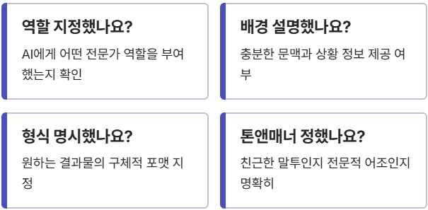 - 역할 부여(Persona): "너는 10년 차 베테랑 마케터야"처럼 AI에게 페르소나를 지정해 보세요. 문체와 관점이 확연히 달라집니다.