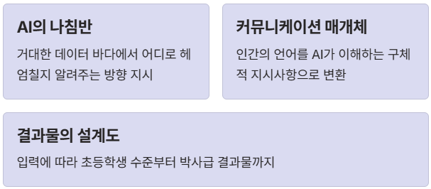 - 커뮤니케이션의 핵심: 인간의 언어(자연어)를 AI가 이해할 수 있는 구체적인 지시사항으로 변환하는 매개체입니다.