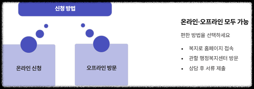 - 신청 장소: 거주지 관할 읍·면·동 행정복지센터를 방문하거나 '복지로' 홈페이지를 통해 온라인으로 간편하게 신청하세요.