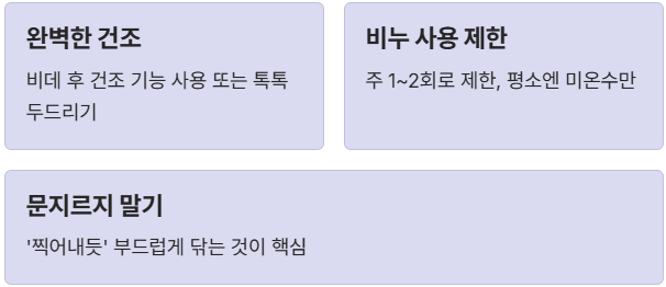 - 완벽 건조: 수건으로 비비지 말고 드라이기(찬바람)나 부채를 이용해 보송보송하게 말려주세요.