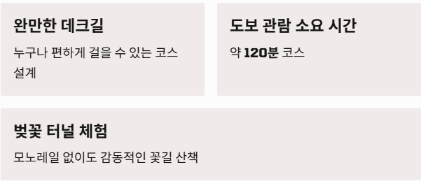 • 2구간 (전망대 코스): 가장 높은 곳으로 올라가는 구간으로, 벚꽃 핀 숲 전체를 조망하기에 최적입니다.
