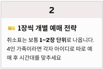 - '1장씩' 개별 예매 전략: 4인 가족 티켓을 한꺼번에 잡으려 하면 절대 성공할 수 없습니다. 취소표는 보통 1~2장 단위로 나옵니다. 아이디를 여러 개 활용하거나, 1장씩 따로 예매하여 시간대를 비슷하게 맞추는 것이 현실적인 전략입니다.