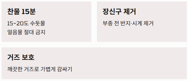 - 장신구 제거하기: 화상 부위는 시간이 지나면 부어오릅니다. 부종이 생기기 전에 반지, 팔찌, 시계 등을 신속히 제거하여 혈액 순환 장애를 예방해야 합니다.