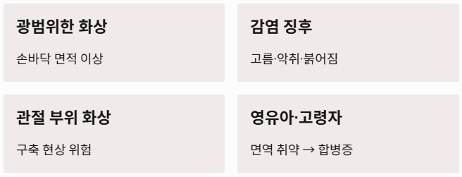 - 고령자 및 영유아: 면역력이 약한 층은 작은 화상으로도 합병증이 생길 수 있으니 초기에 진료를 받는 것이 안전합니다.