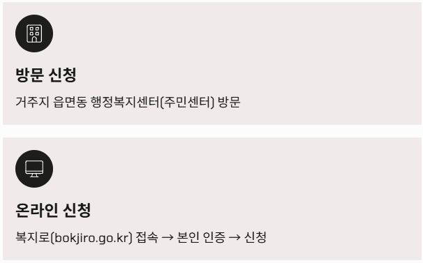 - 방문 신청: 거주지 관할 읍면동 행정복지센터(주민센터)에 직접 방문하여 신청서와 증빙서류를 제출합니다.
