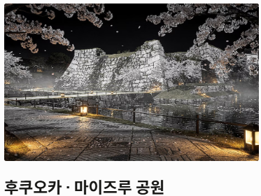 - 📌 후쿠오카 - 마이즈루 공원: 후쿠오카성 유적과 함께 벚꽃이 만개하여 역사와 자연의 조화를 느낄 수 있는 곳이에요. 밤에는 야간 조명으로 더욱 로맨틱해집니다.