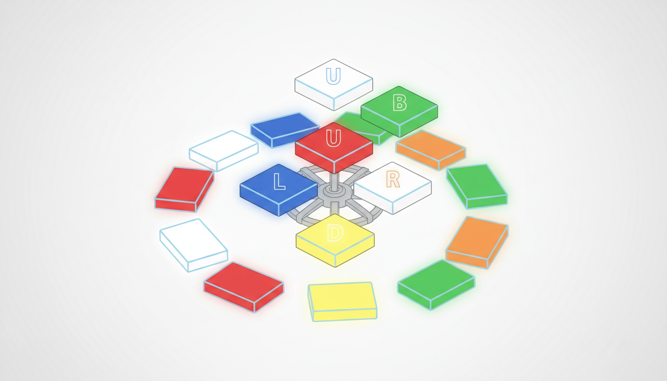 첫 번째 층을 완성했다면, 이제 중간층, 즉 2층을 맞출 차례입니다. 2층에는 총 4개의 엣지 조각이 들어가야 합니다. 윗면(U)에서 노란색이 없는 엣지 조각을 찾으세요. 이 조각들을 2층의 올바른 위치로 보내주는 공식이 필요합니다.