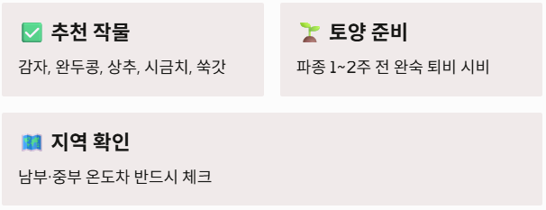 | 씨감자 | 3월 초순 ~ 중순 | 3월 중순 ~ 하순 |