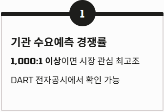 - 기관 수요예측 경쟁률: 보통 1,000:1을 넘으면 시장의 관심이 뜨겁다고 판단합니다.