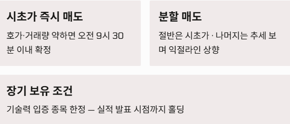 - 시초가 매도 전략: 장 시작 전 호가 흐름이 약하거나 거래량이 부족하다면 장 시작 직후 5~10분 이내에 수익을 확정 짓는 것이 안전합니다.